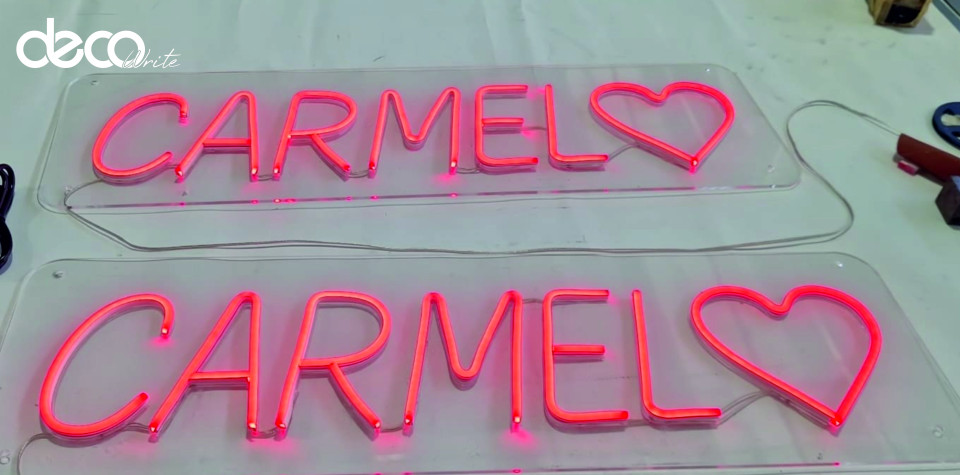 שלט נאון לד גמיש גוון צבע צהוב קו כפול ע"ג פרספקס שקוף