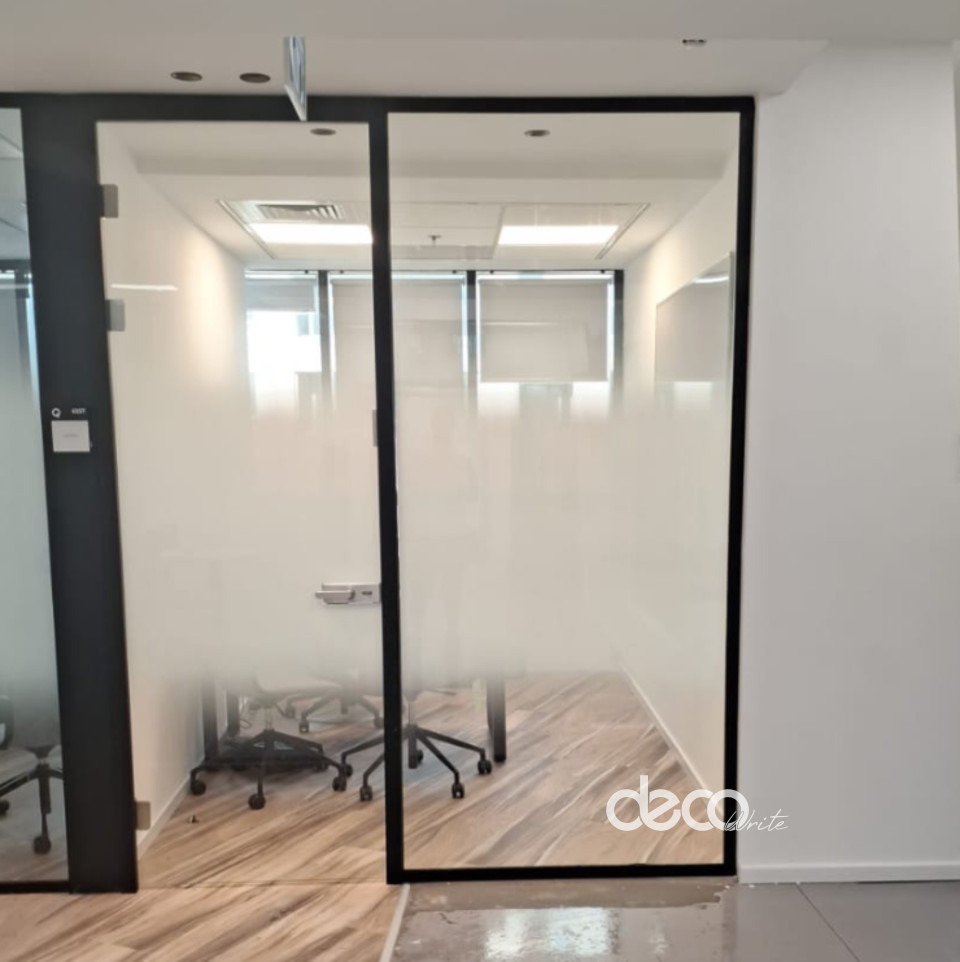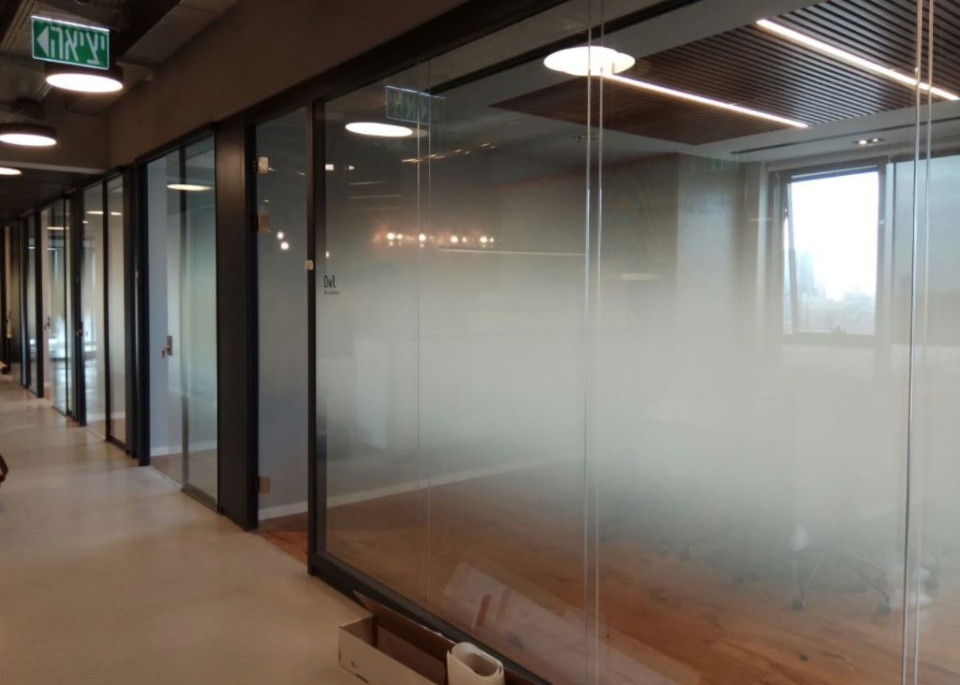 מדבקת התזת חול במרכז קיר זכוכית לפרטיות בחדר ישיבות